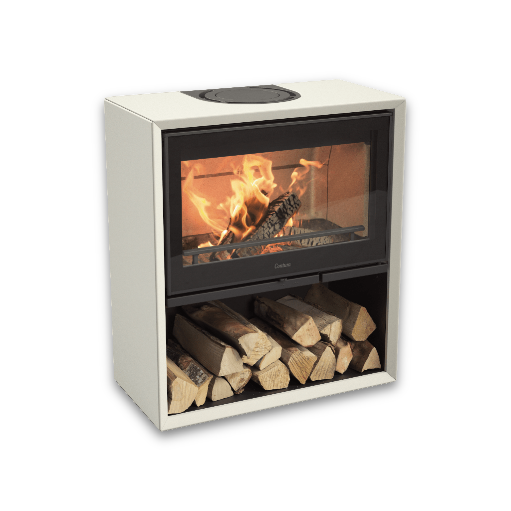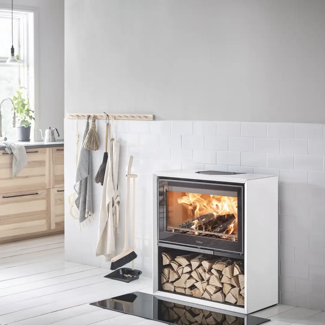 Contura 310G finns i svart eller vitt utförande och kan enkelt kombineras med fristående vedförvaring i matchande design. Du väljer mellan flera olika vedfack och praktiska tillval som utdragslåda – allt för att skapa en personlig eldstad som passar just ditt hem. Brännkammaren rymmer ved upp till en halv meter och gör kaminen till ett effektivt och användarvänligt värmealternativ.