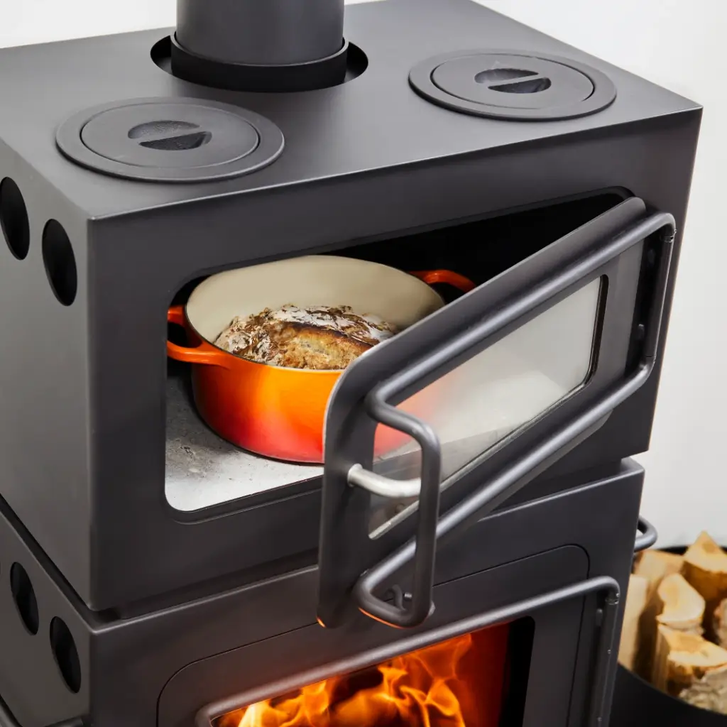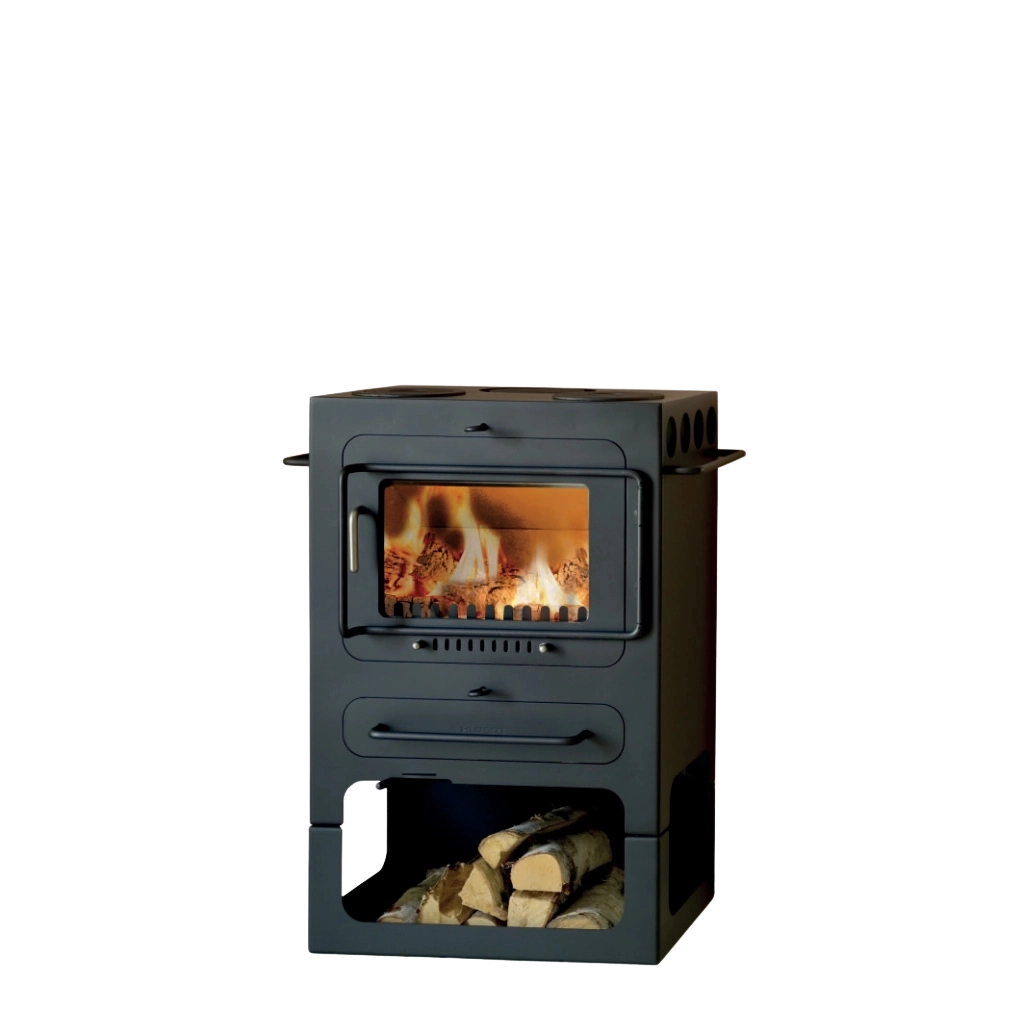 Hwam Classic 4 finns i fyra olika konstellationer. Själva braskaminen har två kokplattor för uppvärmning och tillagning av mat. Du kan lägga till en praktisk bakugn som gör det möjligt att utnyttja värmen från brännkammaren för gräddning av pizza, bröd eller vad du nu vill baka. Genom att lägga till ett vedfack kan du förvara veden under braskaminen – snyggt och praktiskt. Vad mer kan man begära?