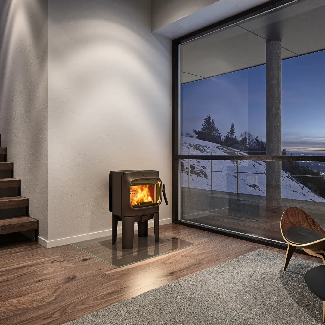 Kaminen har endast ett luftreglage vilket gör den enkel att använda – perfekt för både nybörjare och erfarna eldare. Du kan välja mellan traditionella ben eller en stilren sockel beroende på din inredningsstil. Som tillval finns även en elegant täljstenstopp som ger extra värmelagring.