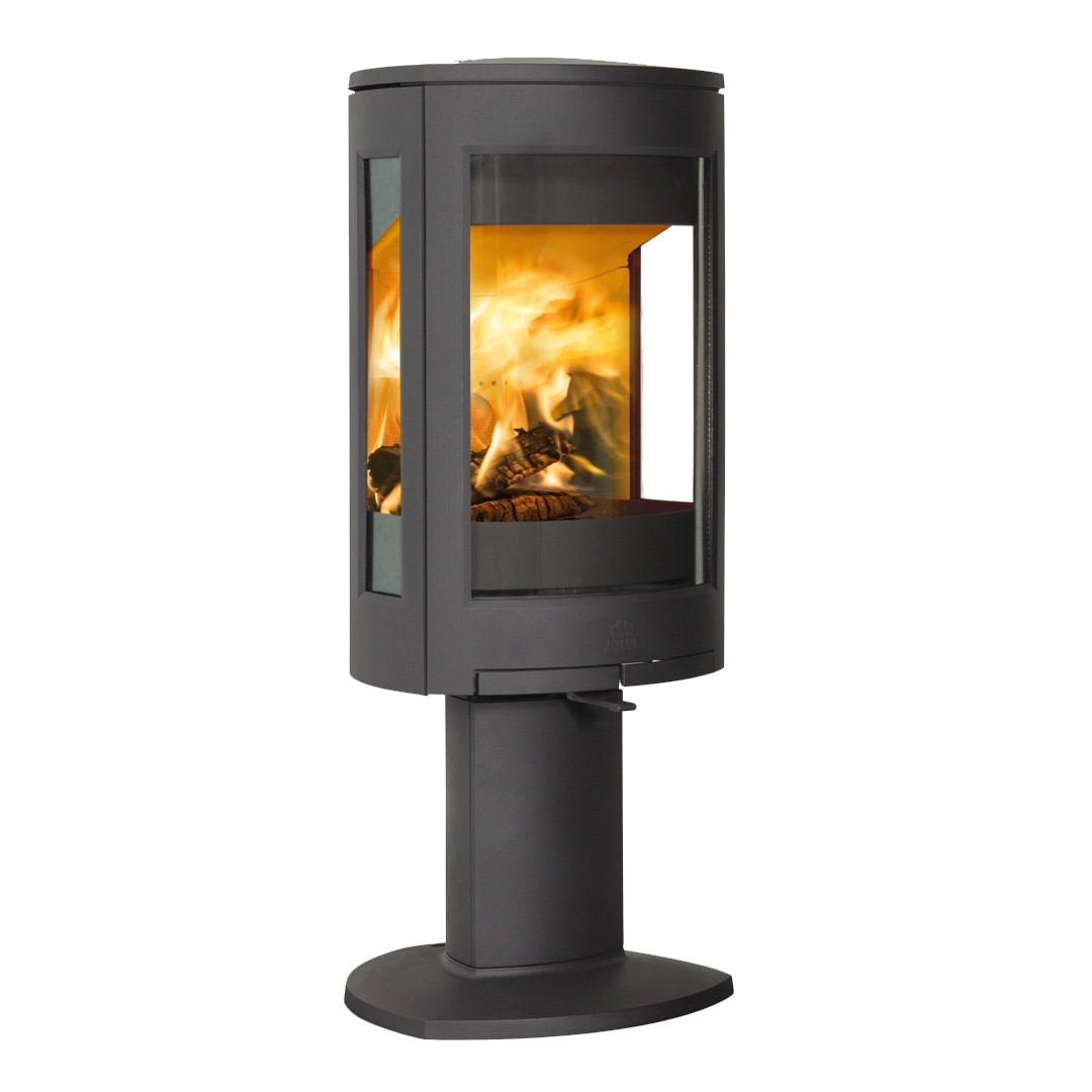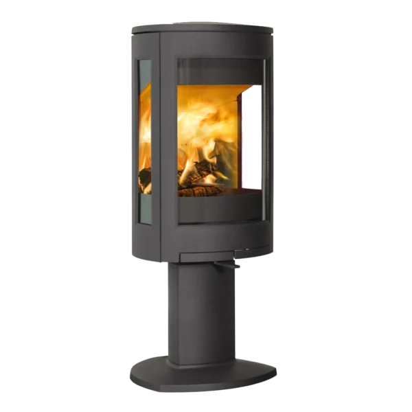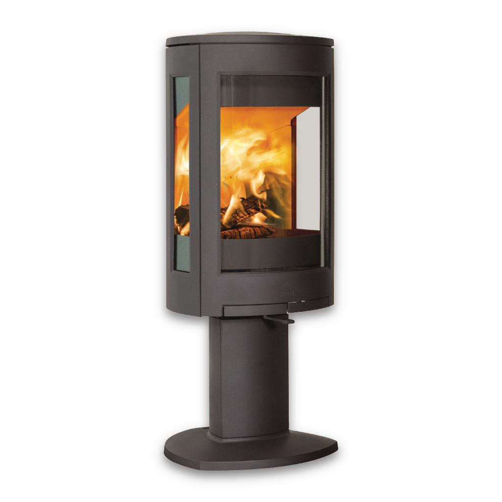 Brännkammaren är placerad på en stabil pelare, vilket ger kaminen ett lätt och luftigt uttryck. De stora glasytorna ger dig full insyn till lågorna från tre sidor och skapar en unik visuell upplevelse som blir hemmets centrum. Den moderna formen kombinerar stil och funktion, och gör att F 373 passar både i klassiska och moderna bostäder.
