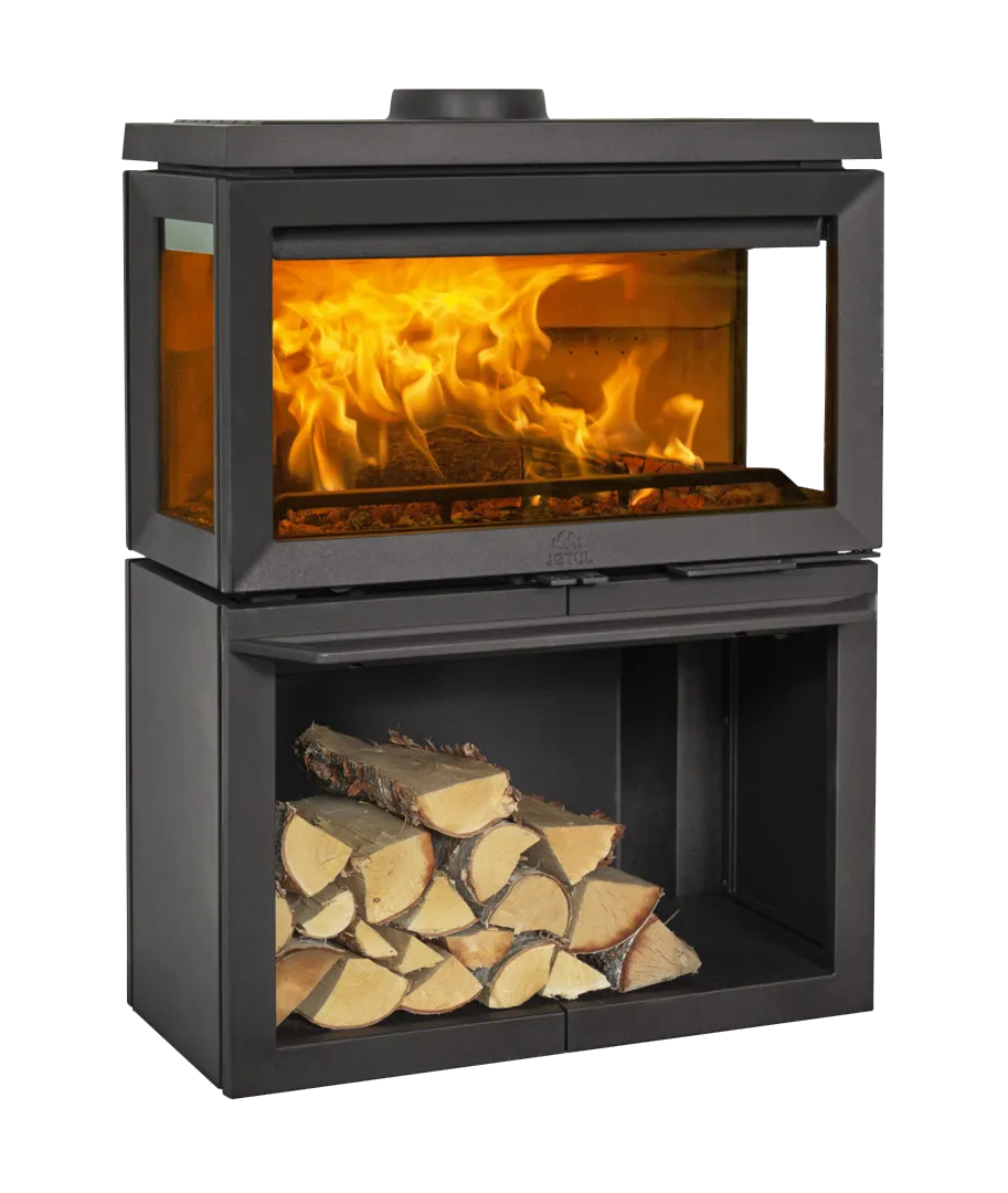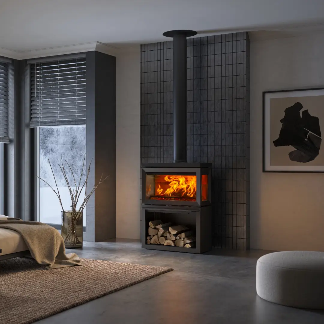 I sockeln finns ett praktiskt utrymme för vedförvaring, vilket gör det enkelt att ha bränsle nära till hands. För ökad säkerhet är kaminen utrustad med brasbegränsare i brännkammaren och snäpplås i luckan.