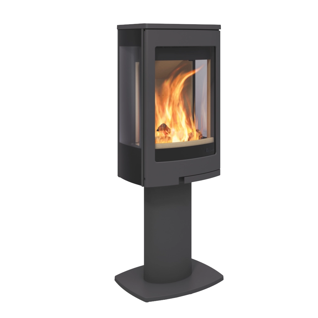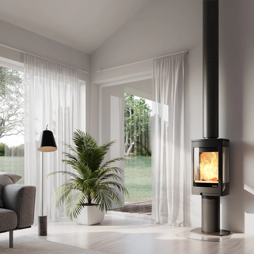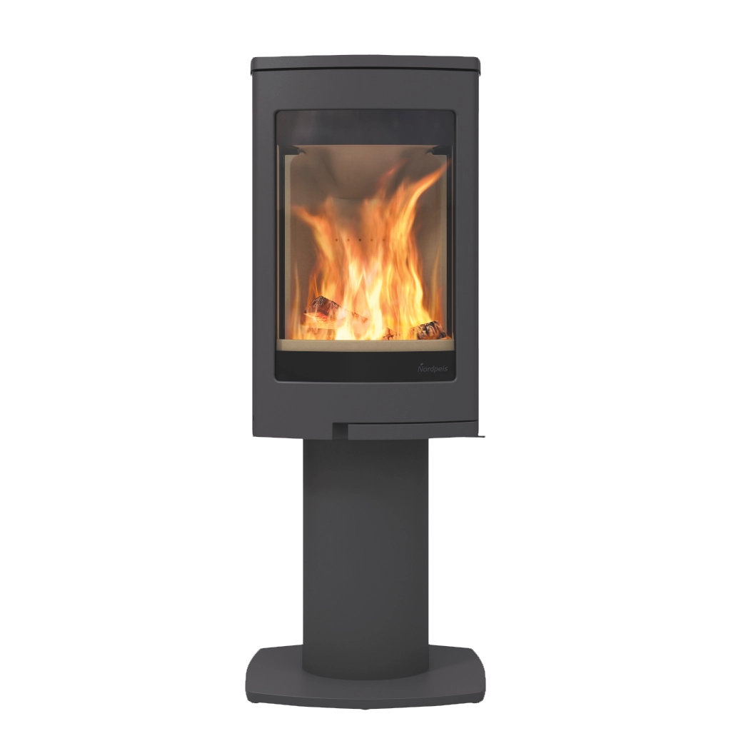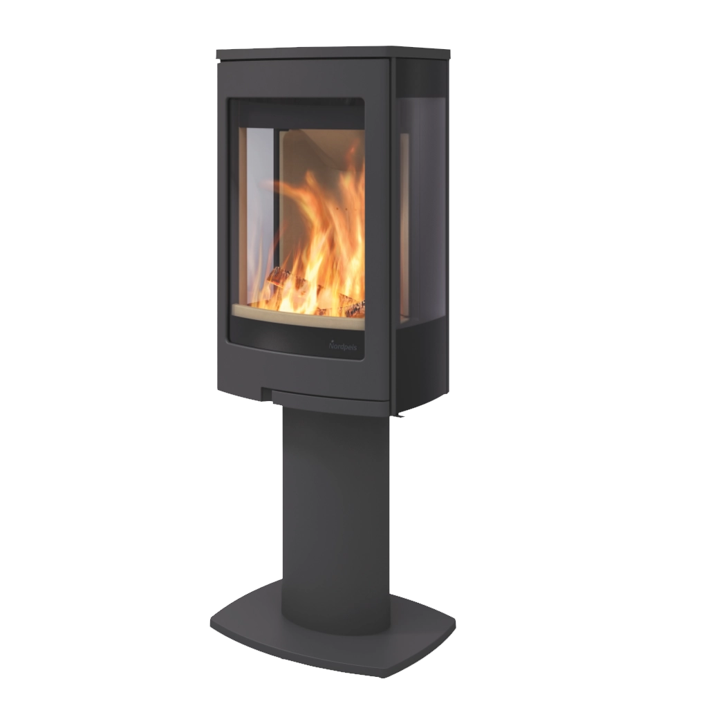 Duo 1 från Nordpeis är en modern och elegant vedkamin på pelare, utformad för att bli ett värmande blickfång i rummet. Med sin stora frontlucka och generösa sidoglas får du en fantastisk vy över lågorna från flera håll – perfekt för att skapa mysig stämning oavsett placering.