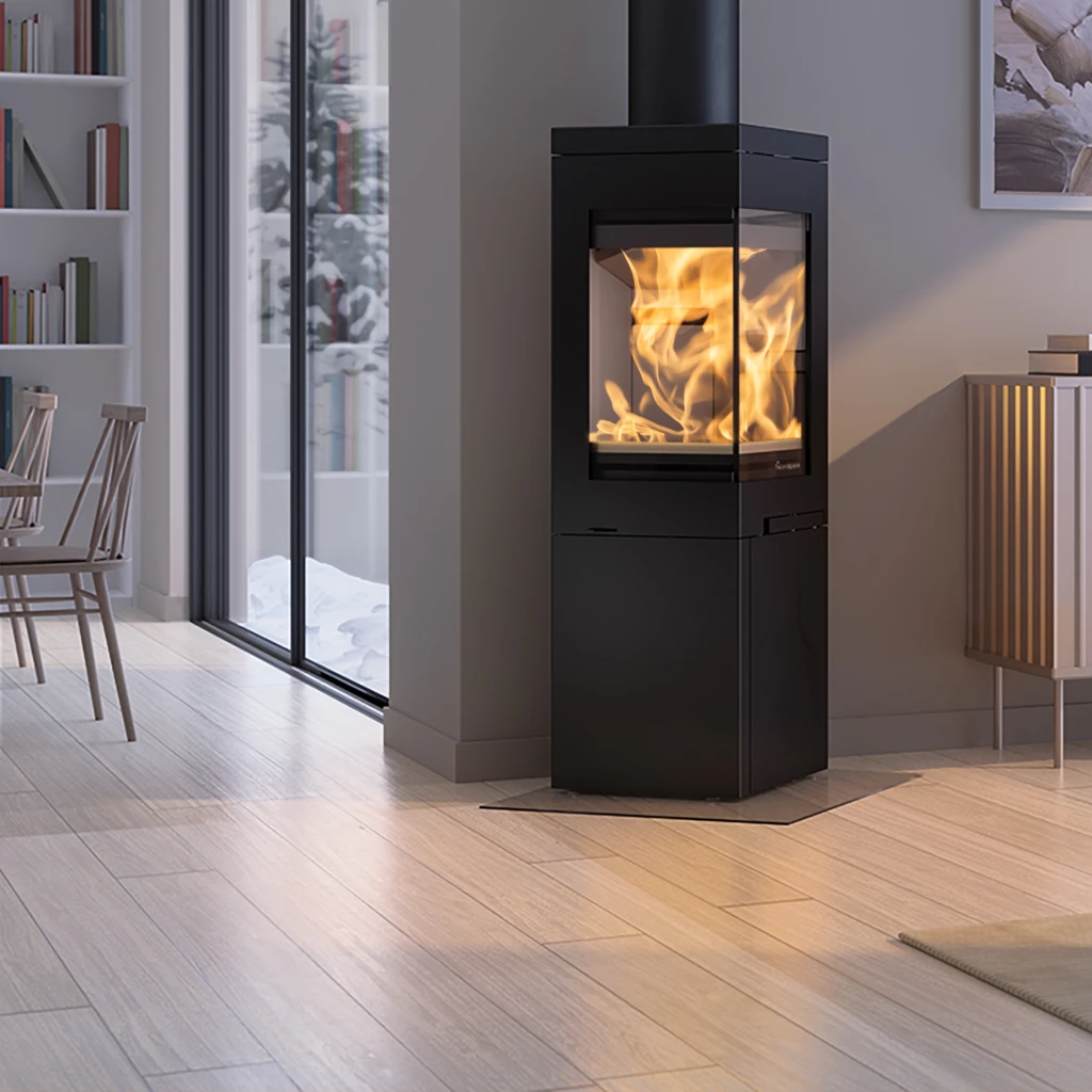 Nordpeis Quadro 2 är en elegant och flexibel vedkamin som förenar modern form med smart funktion. Med sin stilrena design och vinklade glaslucka får du fantastisk insyn till lågorna, oavsett var i rummet du befinner dig. Kaminen är konstruerad för att kunna placeras mot vägg, i hörn eller stå fristående – perfekt för olika planlösningar och stilar.
