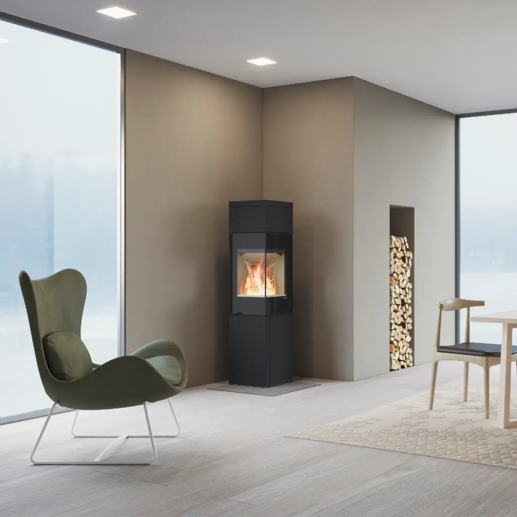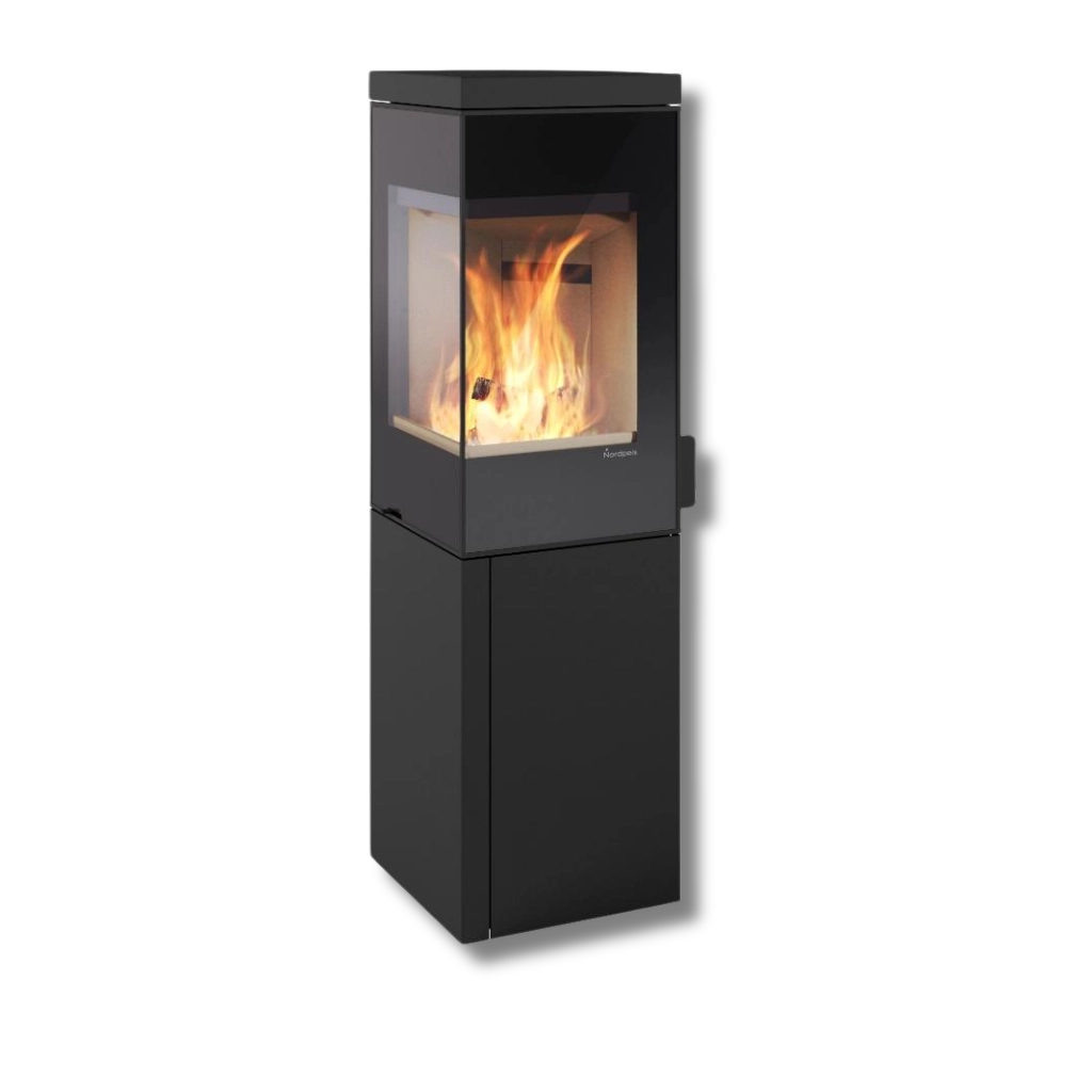 Nordpeis Quadro 3 Exclusive är en modern designkamin med hög underdel och integrerad lucka – perfekt för dig som vill kombinera funktion med stil. De stora vinklade glasrutorna ger en fantastisk insyn till elden från flera håll, vilket skapar en varm och inbjudande atmosfär oavsett var du befinner dig i rummet.