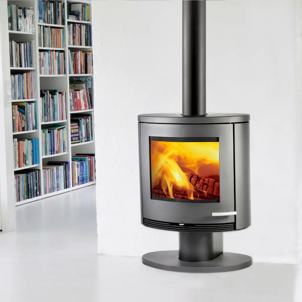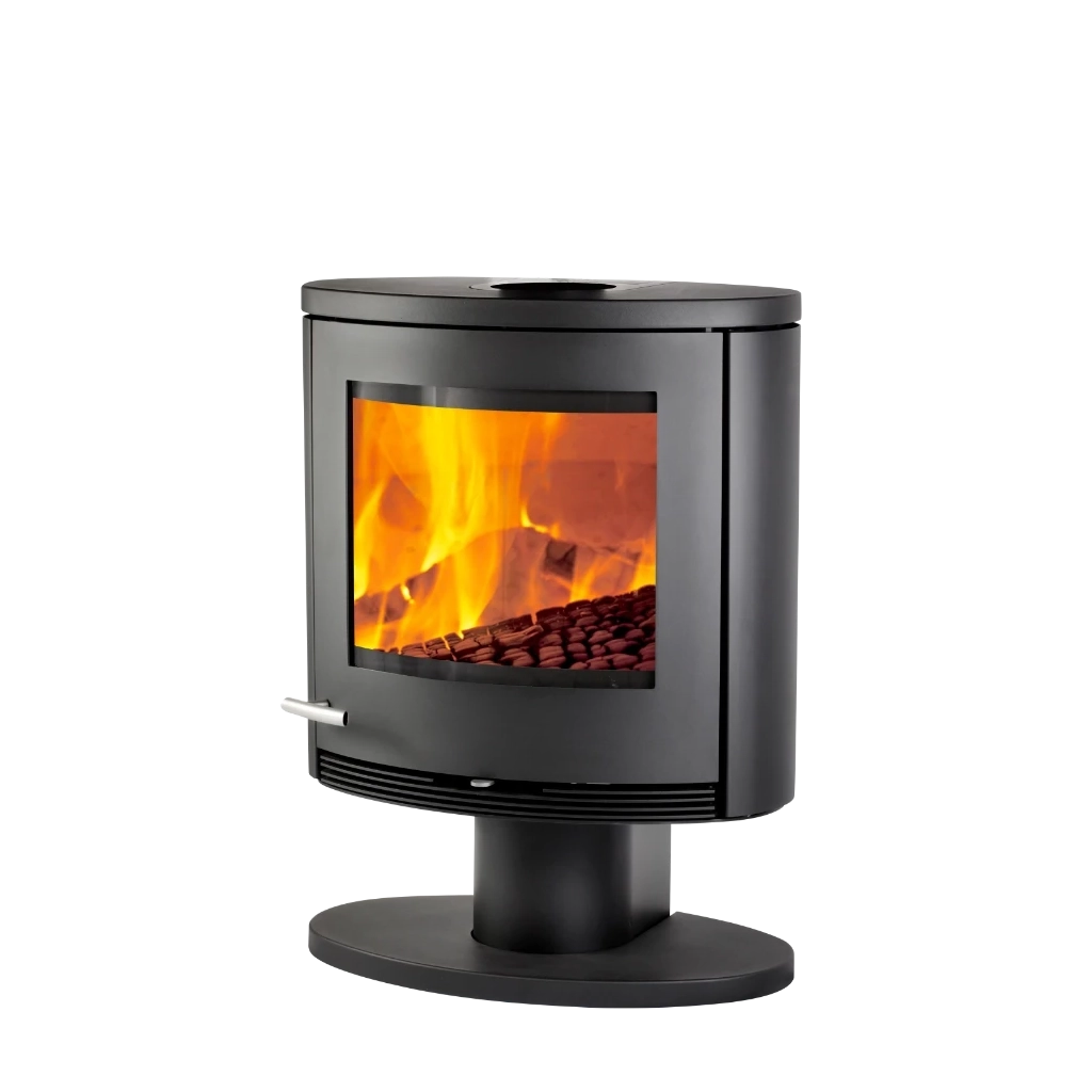 Kaminens stabila gjutjärnsfot ger inte bara ett robust intryck utan bidrar även till att lyfta hela designen – både bildligt och bokstavligt. De rundade stålsidorna förstärker det lätta och organiska intrycket, samtidigt som konstruktionen andas kvalitet och genomtänkt funktionalitet.