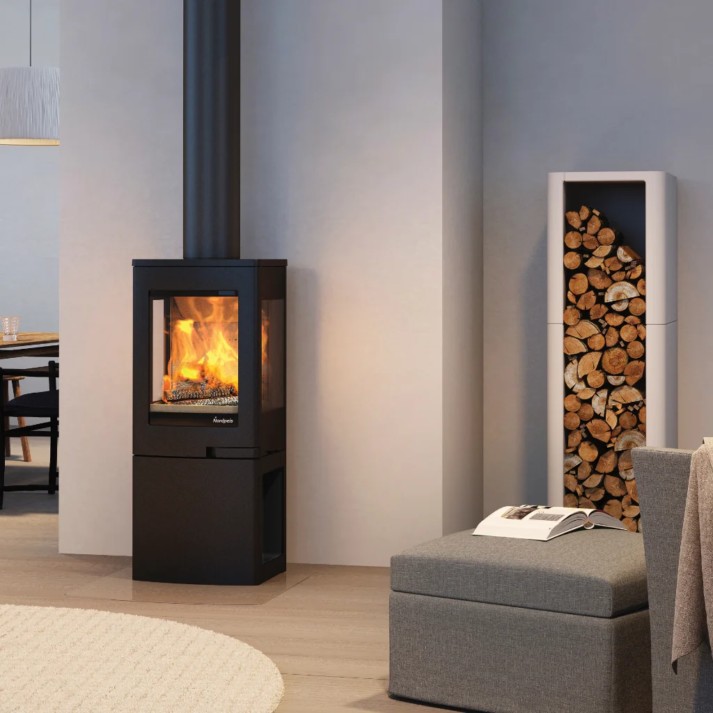 Uno 2 – Stilren liten vedkamin med vedförvaring
