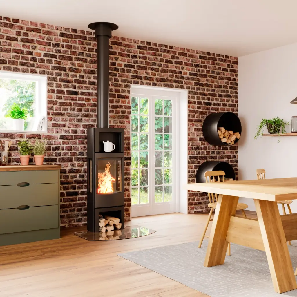 Wiking Miro 5 är en elegant braskamin med möjlighet att komplettera med ett värmemagasin ovanför eldstaden. När kaminen är tänd värms stenarna i värmelagringsfacket upp och lagrar värmeenergi. Efter att elden har slocknat avger stenen långsamt värme, vilket ger en behaglig och energieffektiv uppvärmning av rummet. Kaminen har dessutom stora sidoglas som ger en generös insyn till elden från flera vinklar, vilket skapar en varm och inbjudande atmosfär i hemmet.