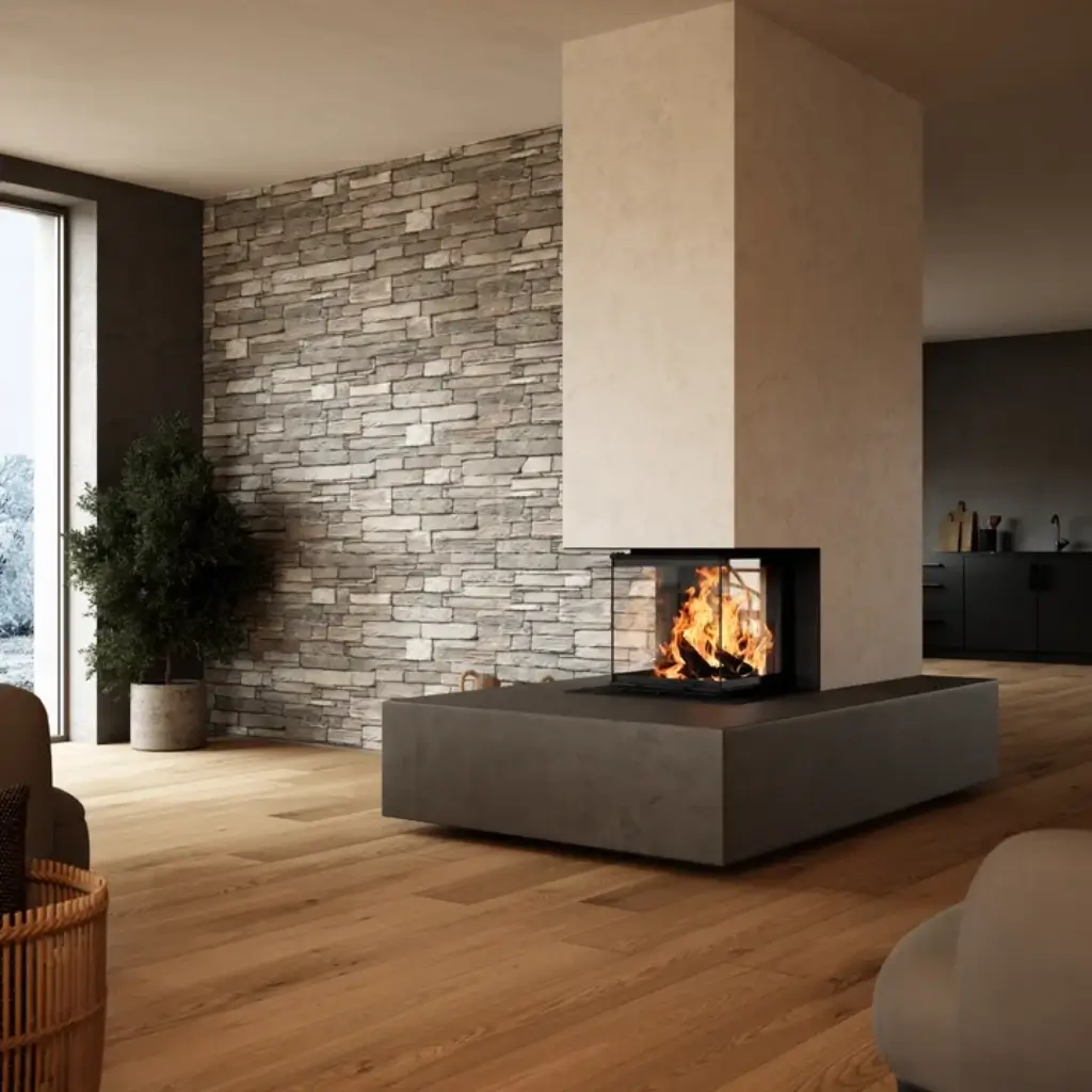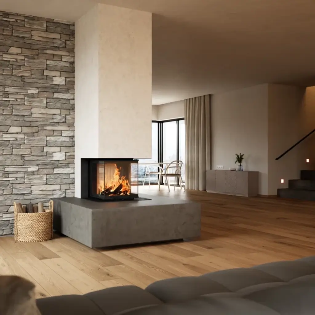 Skapa en eldstad som blir rummets mittpunkt med Brunner BKH 5.0 Panorama 45-45-45-45 – en exklusiv panoramakamin med hisslucka och tre glasytor i perfekt symmetri. Med lika stora glaspartier på 45 x 45 cm åt tre håll får du maximal insyn till elden från alla vinklar, vilket gör denna insats idealisk som rumsavdelare eller mittpunkt i större utrymmen med öppen planlösning.