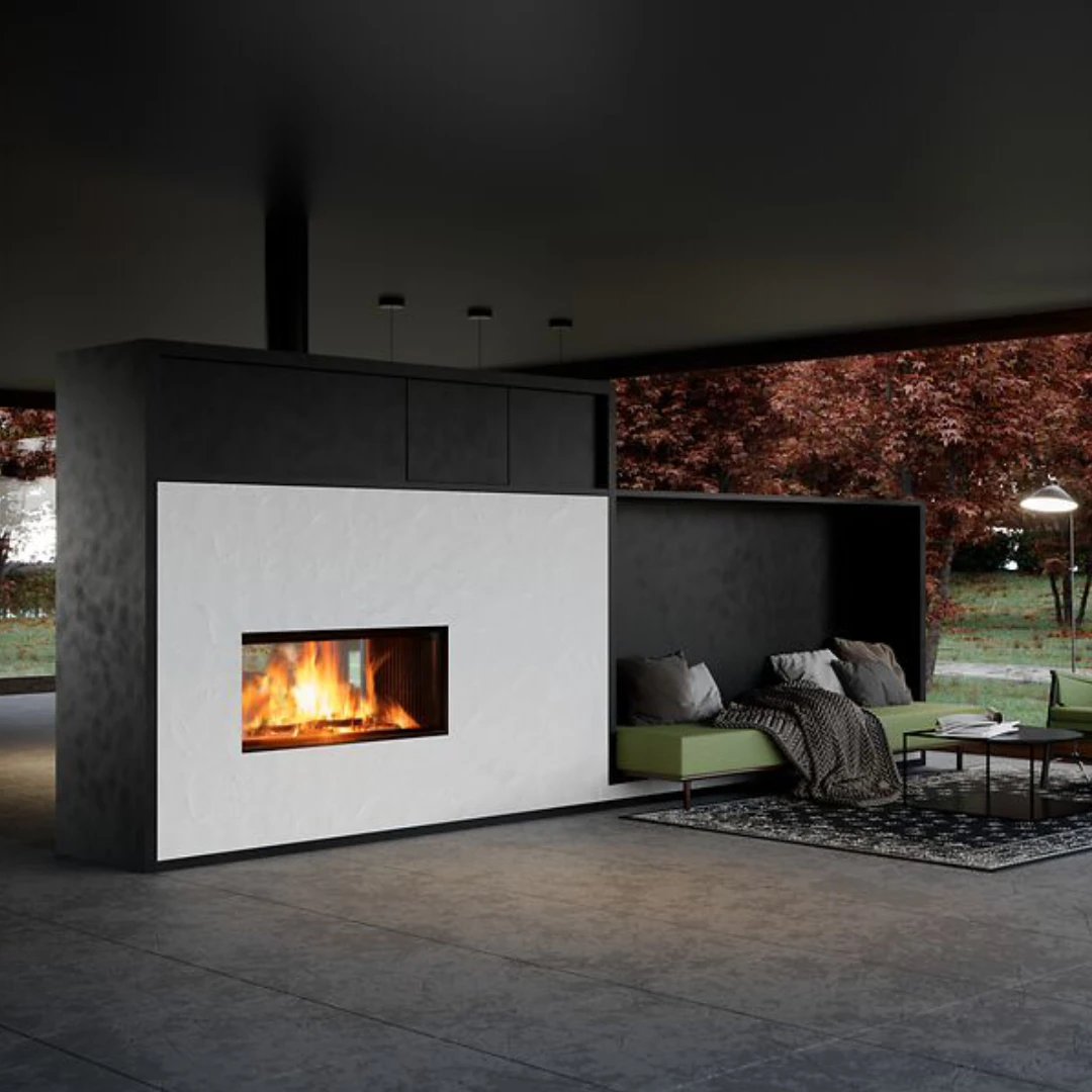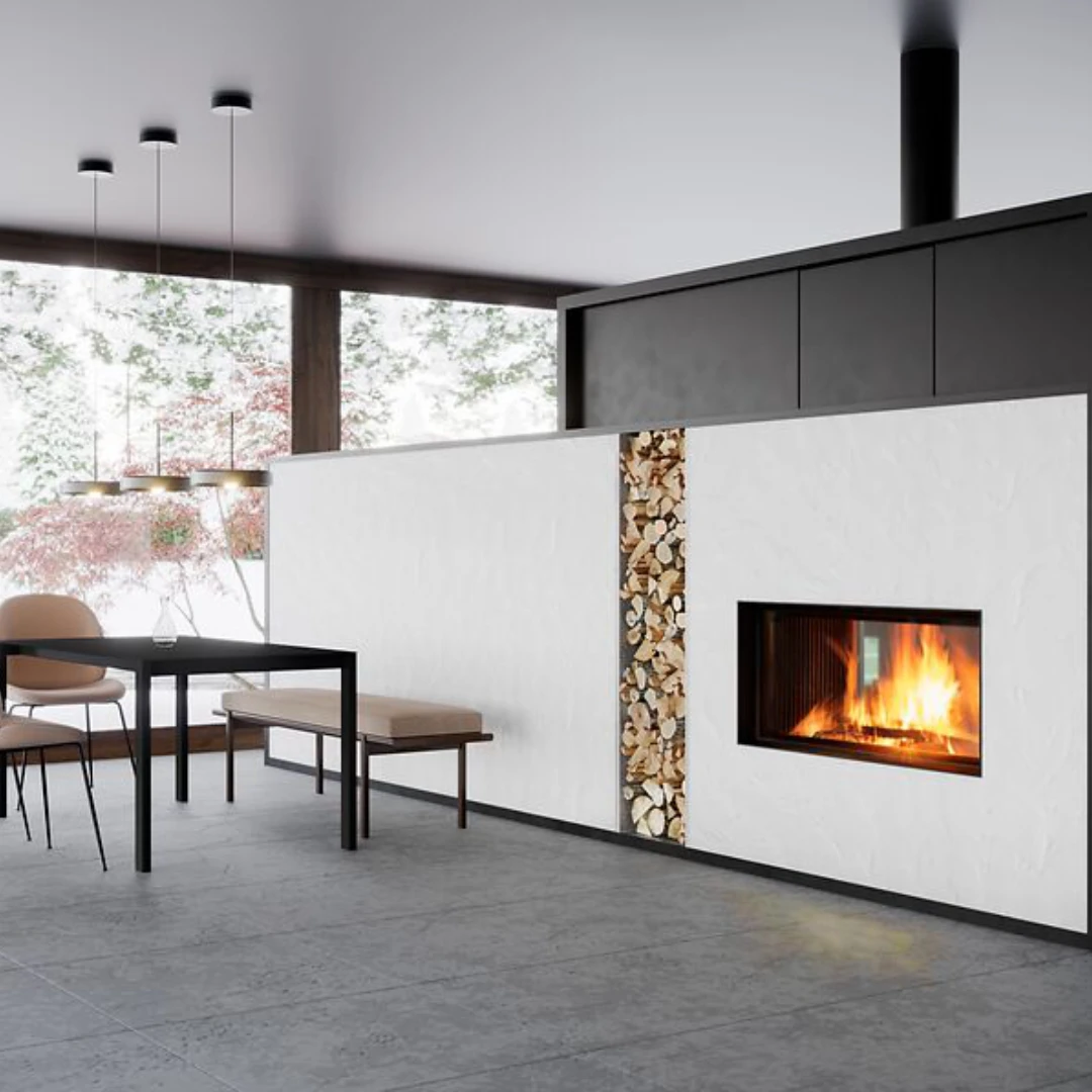 Designen kombinerar robust kvalitet med elegans. Insidan kan fås med chamotte eller gjutjärnsplattor i svart räfflad look – båda alternativ som både skyddar och förhöjer insatsens uttryck. Med valbar värmelagrande massa kan du dessutom njuta av skön värme långt efter att lågorna slocknat.