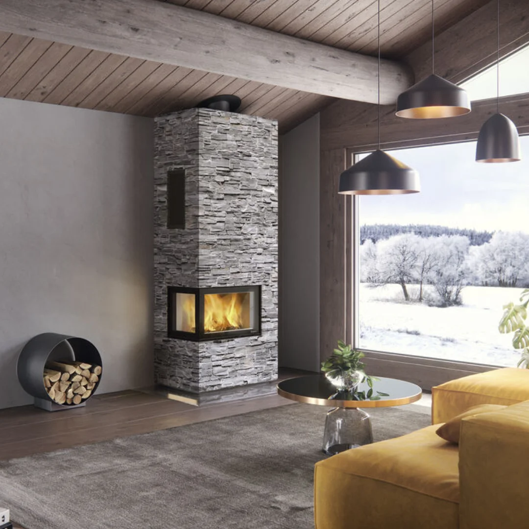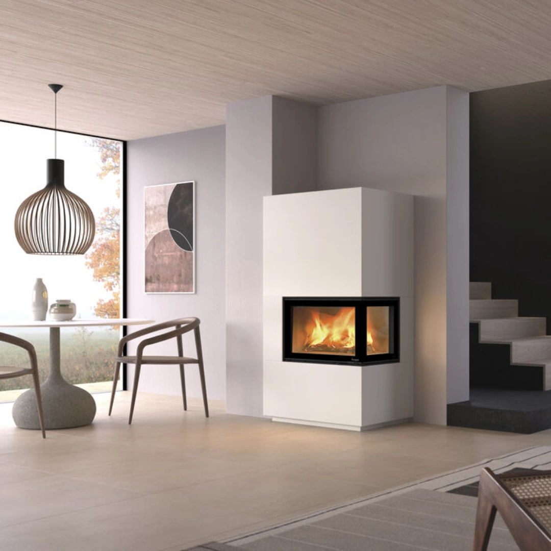 Nordpeis N-29A är vår största vinklade kamininsats och skapar en spektakulär eldupplevelse. Med ett generöst frontglas och extra glas på sidorna får du en nästan panoramisk vy över lågorna. Dubbla glas på alla sidor, tillsammans med en unik reflekterande beläggning på sidoglasen, ger optimal förbränning och hjälper glasen att hålla sig rena längre.