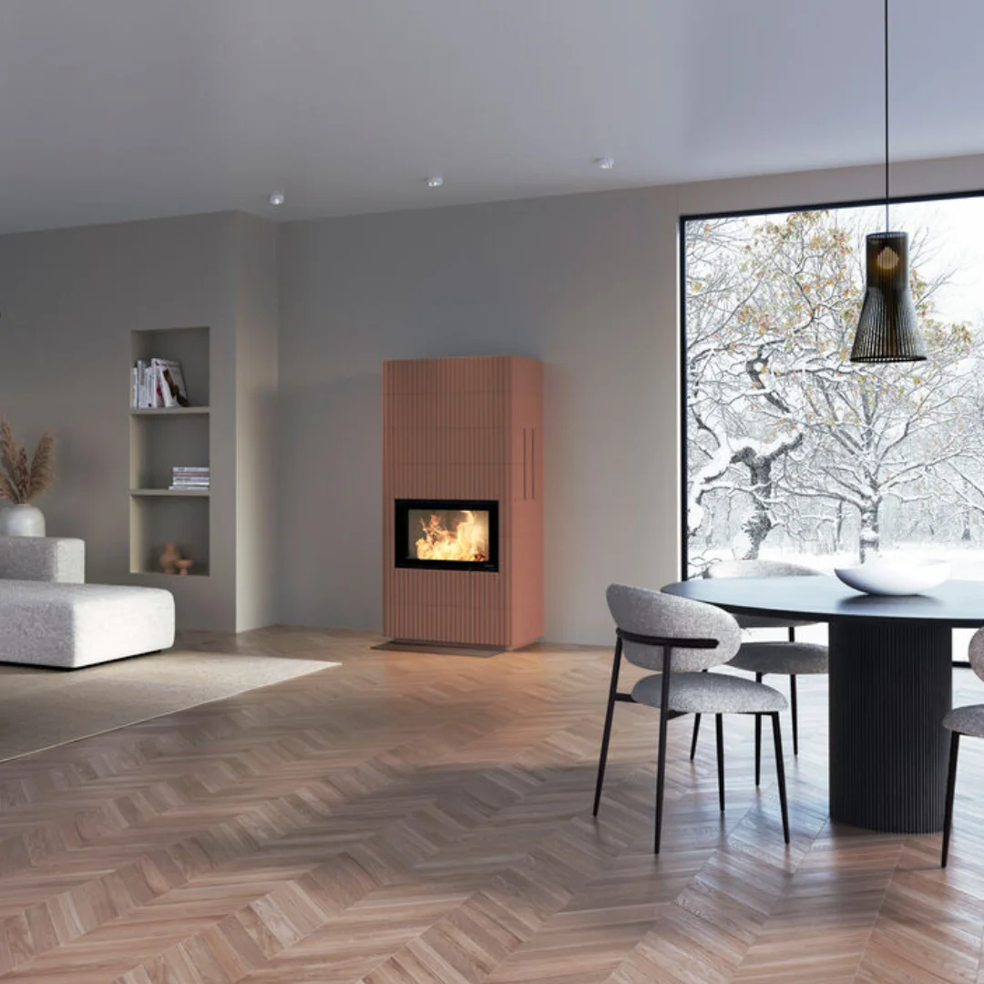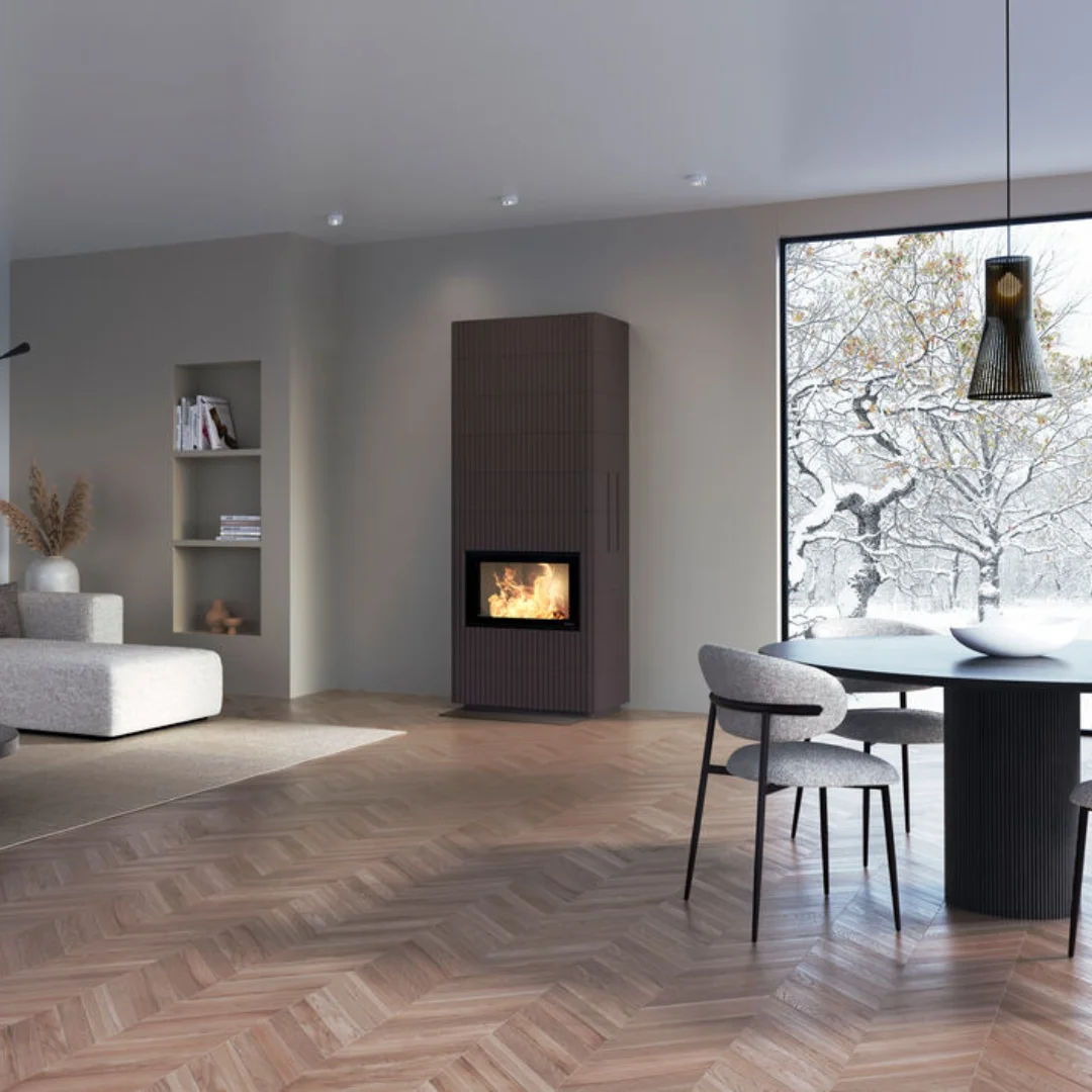 Nordpeis 29 F är vår största kamininsats och bjuder på en storslagen vy över lågorna tack vare det extra stora frontglaset. Den självstängande luckan med automatisk låsfunktion ger trygg användning, medan dubbla glas håller rutan ren längre och gör eldningen både enklare och mer effektiv.