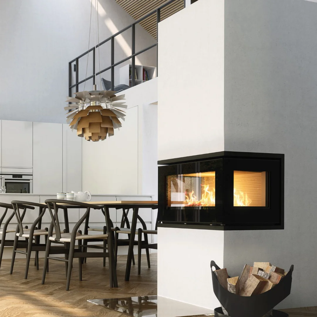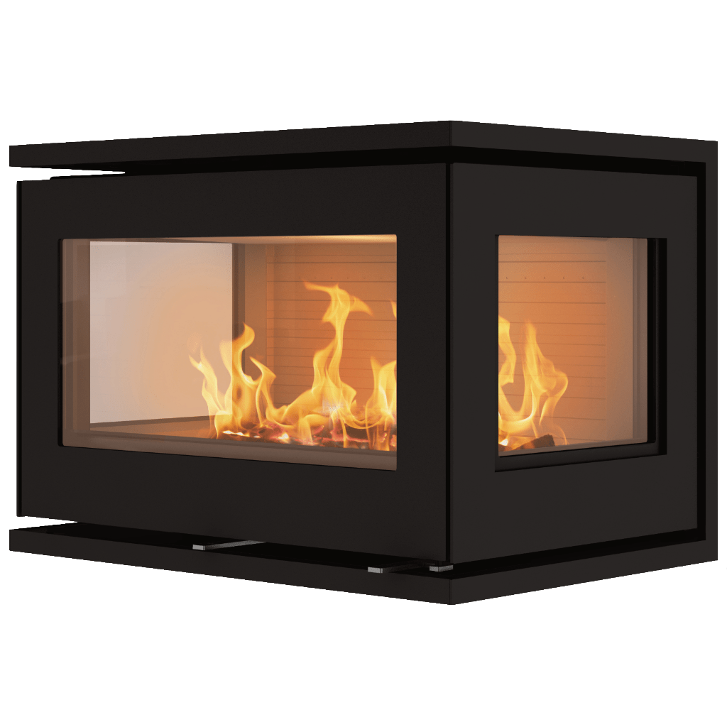 Den rymliga brännkammaren rymmer stora vedträn och ger effektiv, miljövänlig förbränning med låga utsläpp och hög verkningsgrad. Perfekt för dig som söker både värme och design i ett – med elden som levande konstverk från tre sidor.