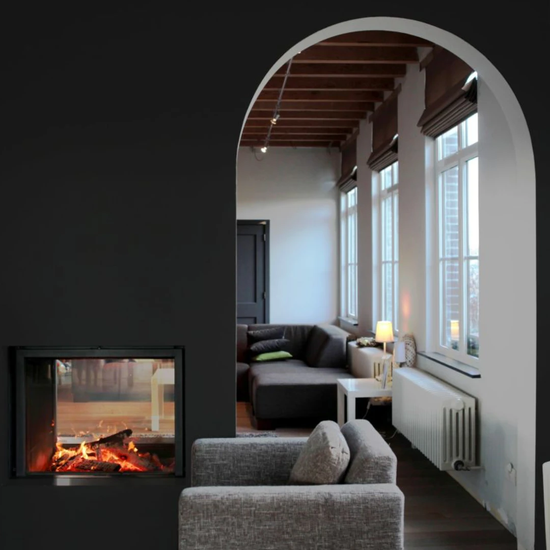 De skjutbara glasluckorna på båda sidor gör att du får full kontroll över både eld och estetik. Den justerbara värmeeffekten och möjligheten att ansluta till uteluft säkerställer en effektiv och miljövänlig uppvärmning. Du kan även välja att komplettera med luftkanaler och en fläktlösning för att sprida värmen till fler delar av bostaden.