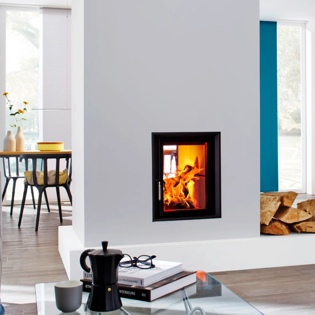 Glasluckan på 52 x 37 cm ger en vacker vy över lågorna från båda sidor. Dörren kan väljas med höger- eller vänsterhängning, vilket ger flexibilitet vid installation. Modellen finns med frontpanel i gjutjärn eller stål, vilket låter dig anpassa utseendet efter hemmets stil.
