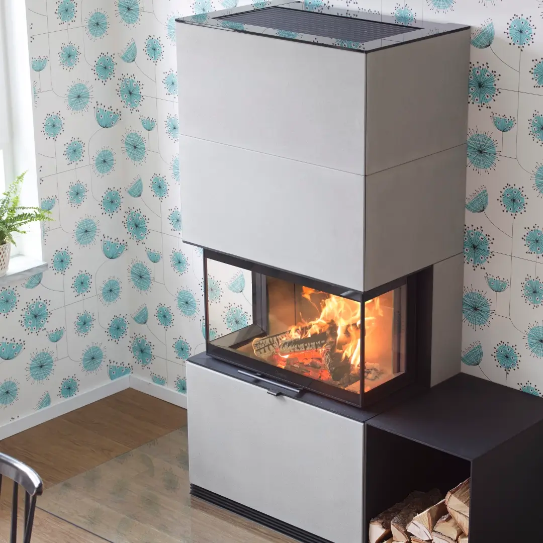 Med glas på tre sidor får du en fantastisk vy över lågorna, oavsett var i rummet du befinner dig. Den generösa brännkammaren gör det dessutom möjligt att elda med större vedträn – för både långvarig värme och en imponerande brasa.