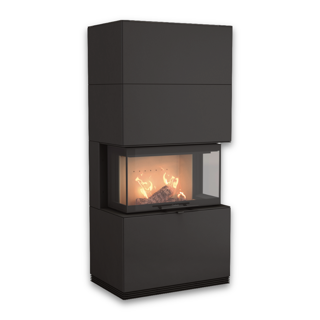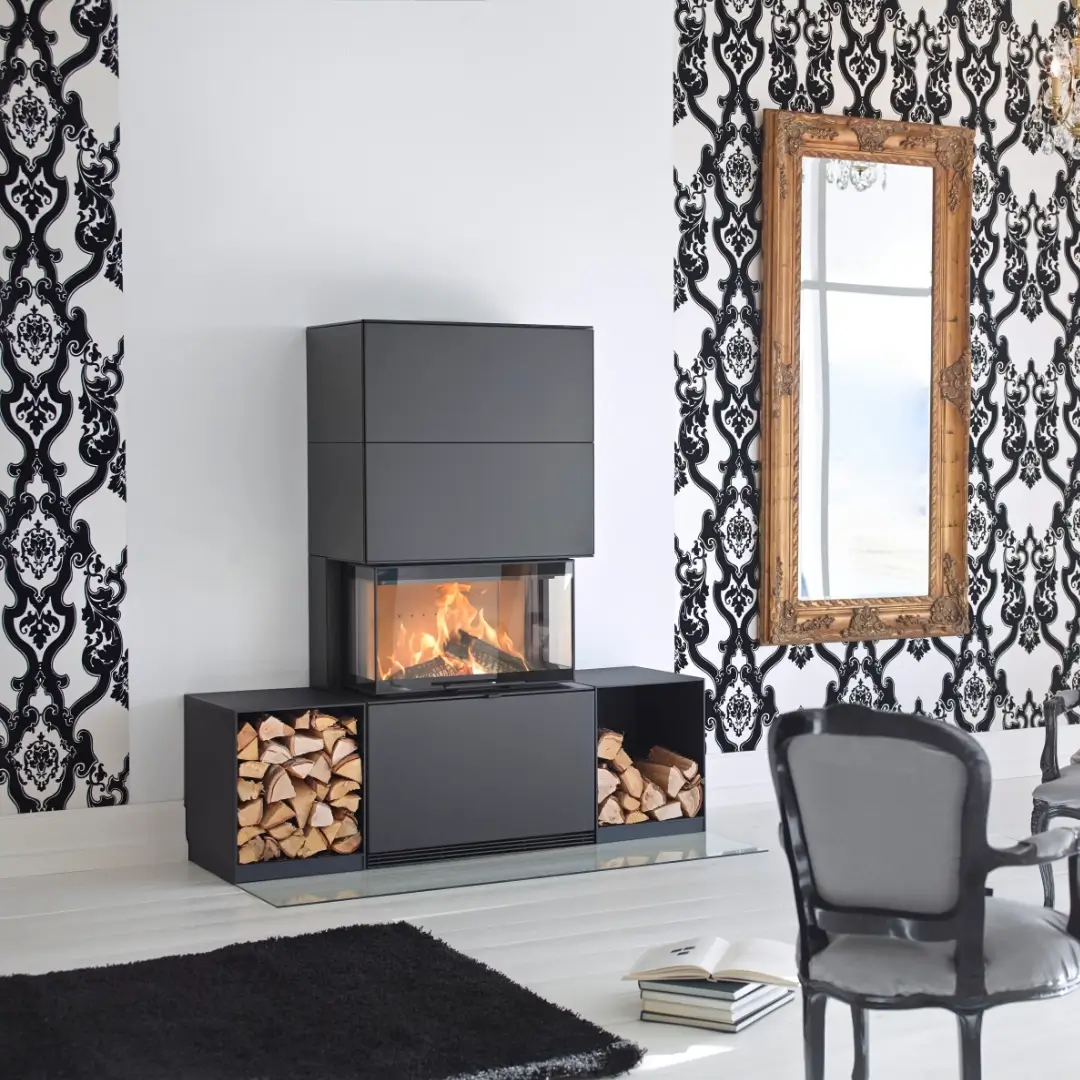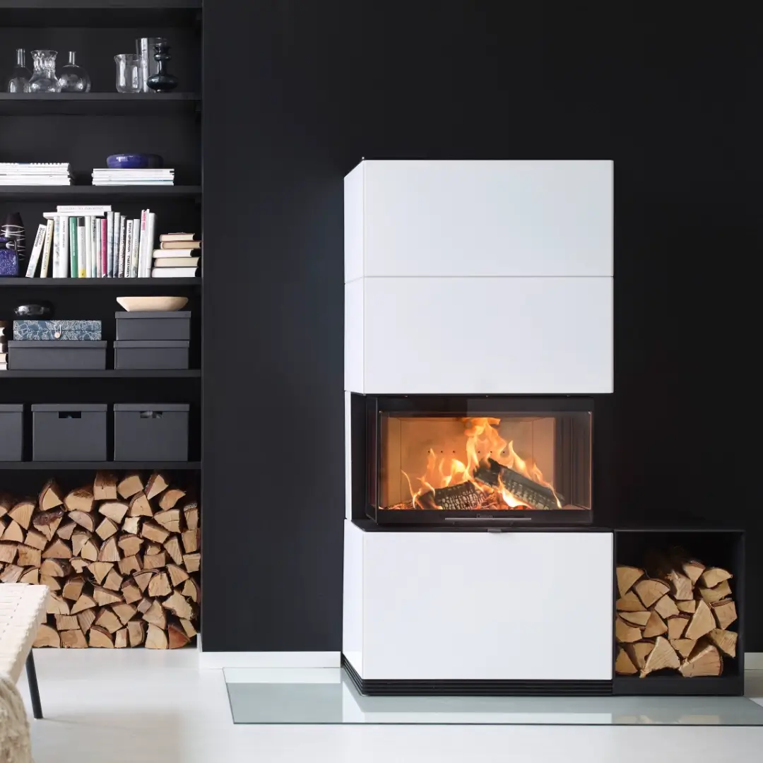 Matcha insatsen med ett svart vedfack för praktisk förvaring och en helhet som smälter in i inredningen. För dig som vill ha extra värmelagring finns även ett tillval i form av ett Powerstone-magasin, som lagrar värme effektivt och sprider den långt efter att lågorna slocknat.