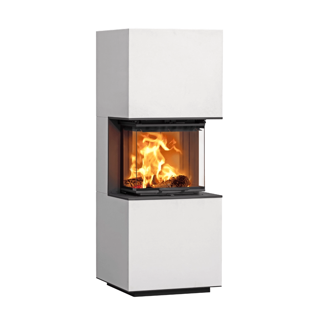 Med en högt placerad brännkammare ger FS 320 både en ergonomisk eldning och en harmonisk visuell upplevelse. De sömlösa glasytorna runt insatsen förhöjer eldstadens uttryck ytterligare och ger ett rent, modernt intryck.