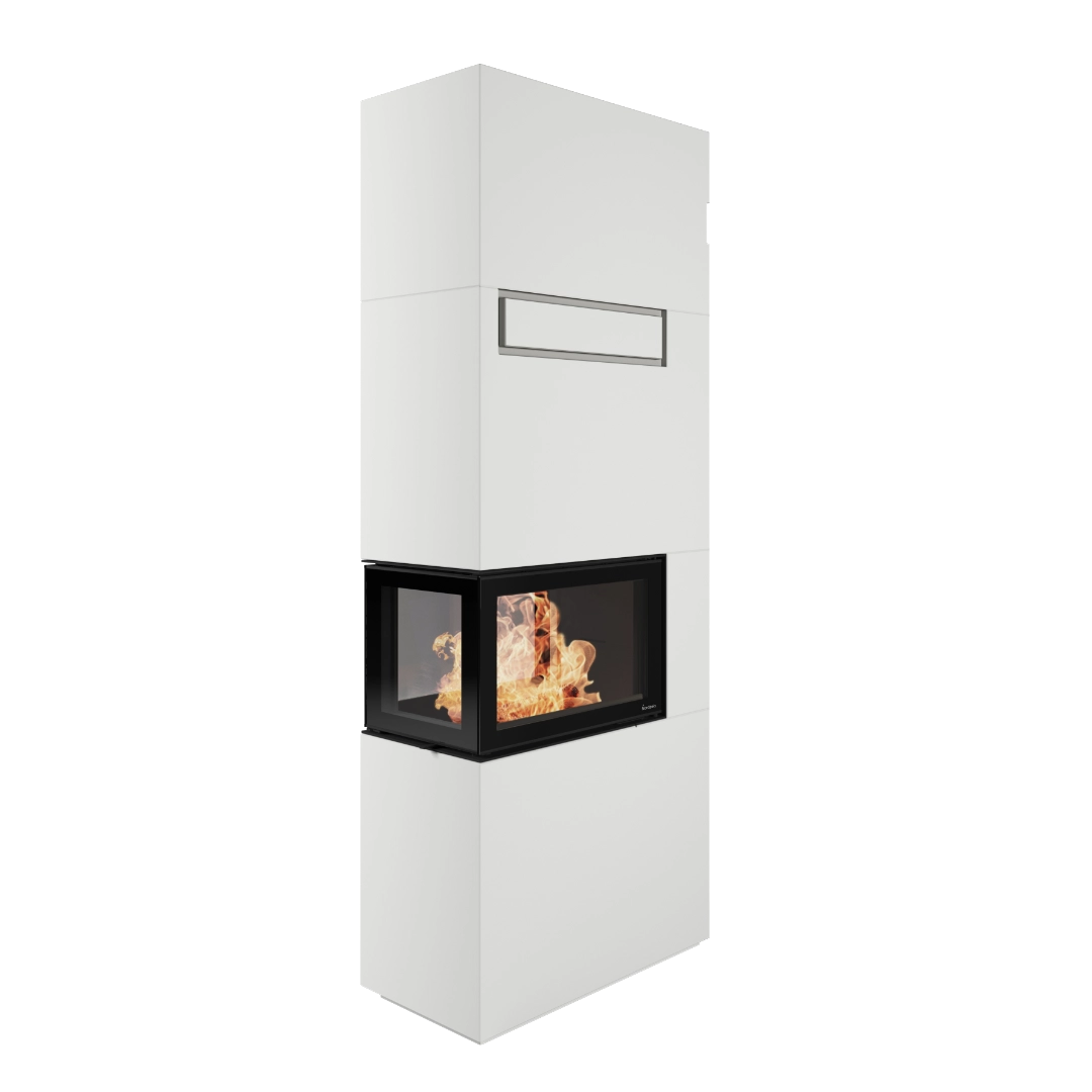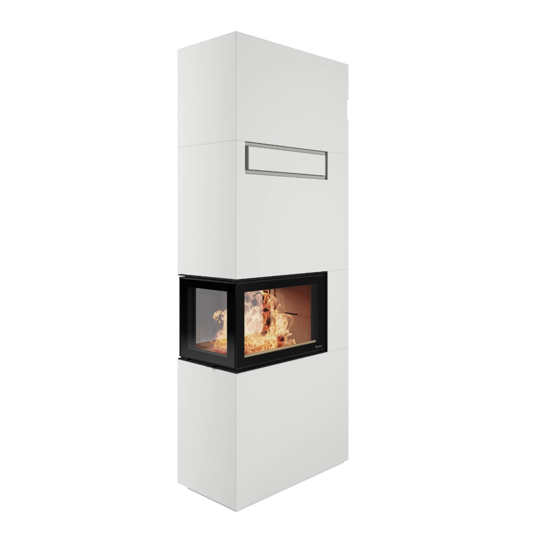 Som tillval kan kaminen kompletteras med värmelagrande massa ovanpå, vilket gör att den inte bara sprider snabb värme när elden brinner, utan även fortsätter att avge behaglig strålningsvärme långt efter att lågorna slocknat. På så sätt får du en kombination av snabb komfort och långvarig värme – helt på dina villkor.