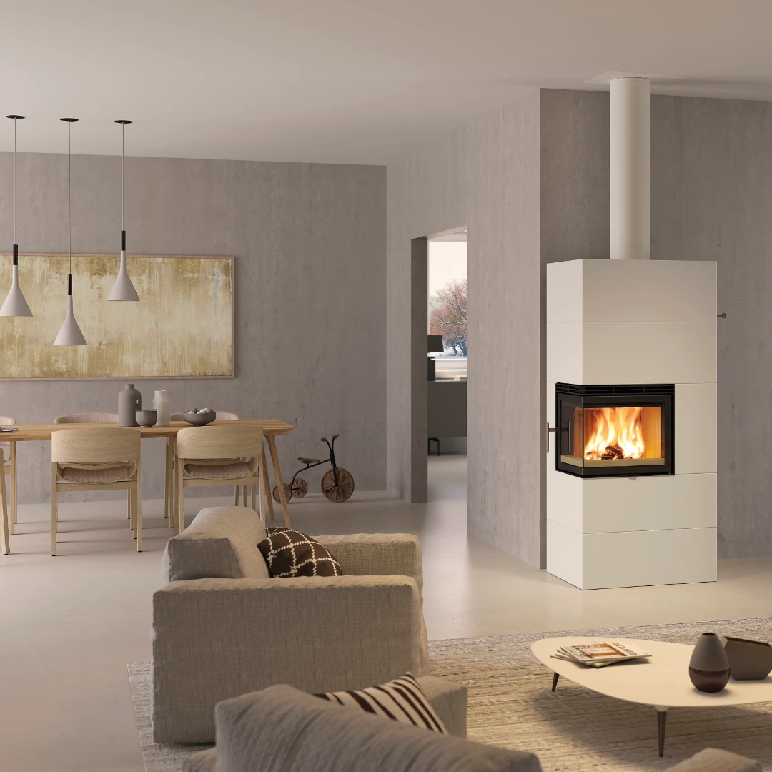 Denna modell är även mycket flexibel när det gäller placering: den kan stå mot en vägg, i ett hörn eller fristående och kan dessutom anslutas till en extern lufttillförselkanal för förbättrad förbränning och inomhusmiljö.