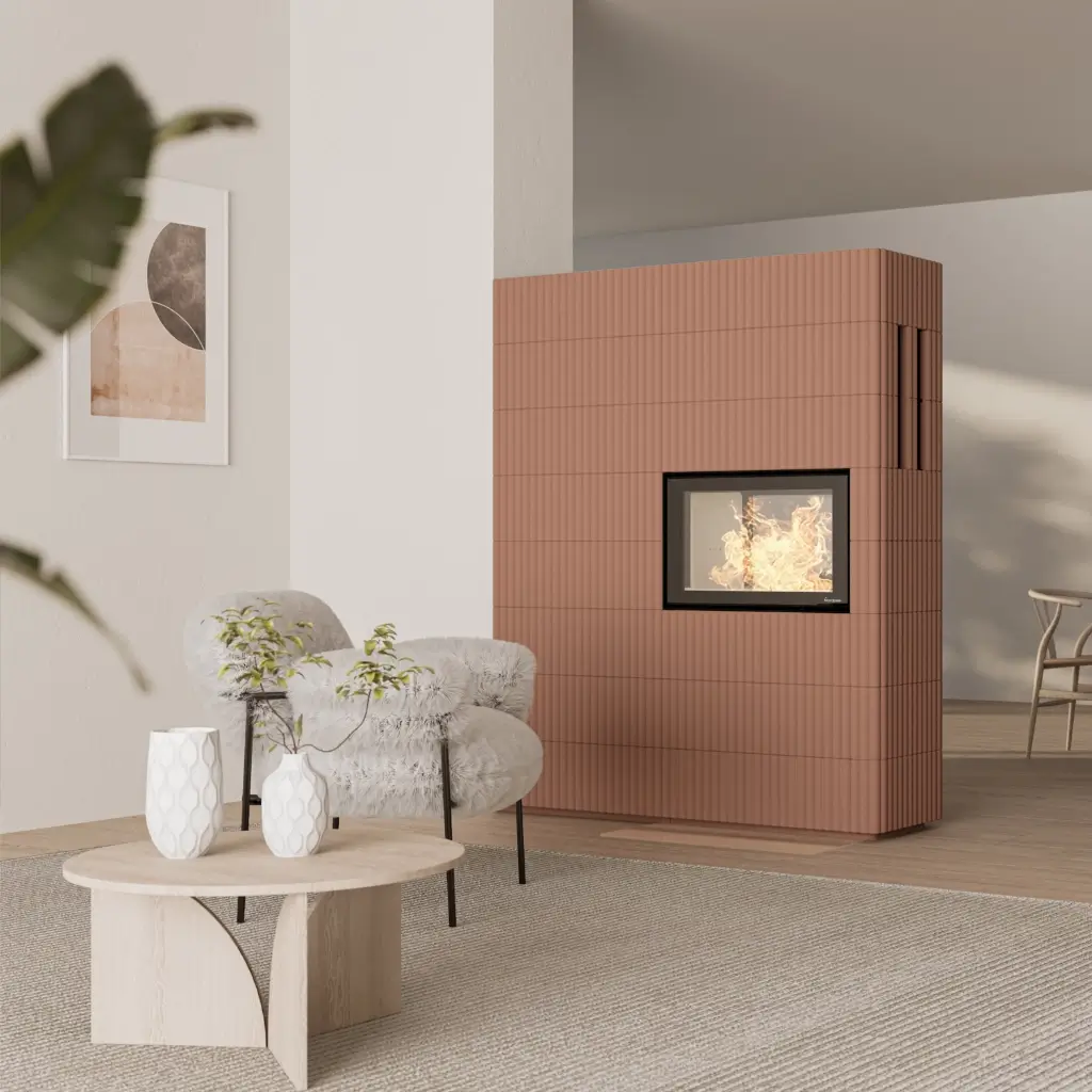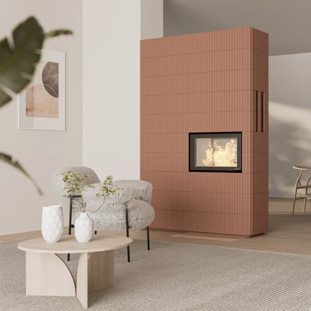 Den vågformade ytan ger kaminen ett levande och unikt uttryck som förändras i takt med rummets ljus och skuggspel. Du kan måla murspisen i en kulör som passar din inredning, vilket gör den till en naturlig och personlig del av hemmet.
