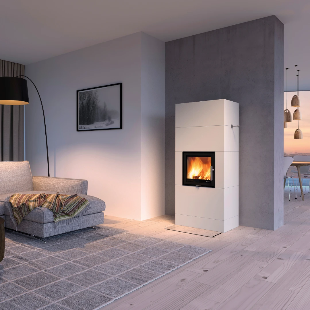 Den smarta brännkammaren har inbyggda kanaler som maximerar vedens energiutbyte för optimal uppvärmning. Bland tillbehören finns en elegant glasfront och ett praktiskt vedfack som kan placeras både under eller vid sidan av kaminen, för extra funktion och stil.