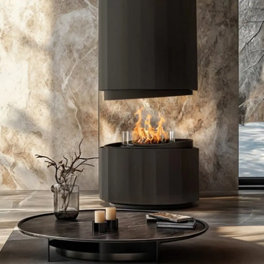 Med sin minimalistiska, svävande design är Planika Pillar mer än bara en värmekälla – den blir ett konstverk i rummet. Den runda formen med öppen låga från en stjärnformad brännare skapar en hypnotiserande visuell effekt. Eldens sken reflekteras i den mattsvarta finishen och skapar en varm, inbjudande atmosfär – perfekt för moderna hem, loungeytor och exklusiva offentliga miljöer.