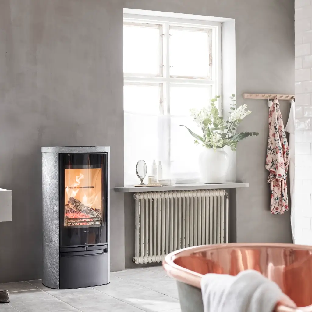 Contura 820TG Style är kaminen för dig som vill ha det bästa av två världar – den naturliga värmelagringen från täljsten och den stilrena känslan av en modern glaslucka. De vackra sidopanelerna i äkta täljsten har en unik ådring som gör varje kamin till ett unikt hantverk. Glasluckan framhäver lågornas sken och reflekterar ljuset i rummet, vilket skapar en varm och levande atmosfär.
