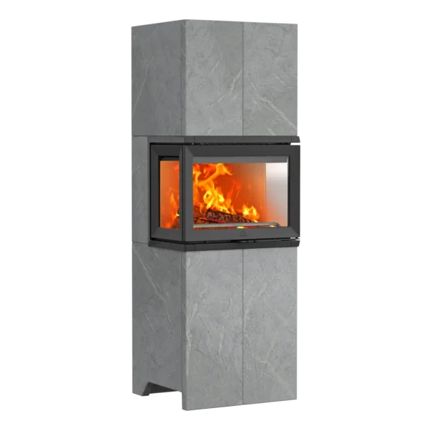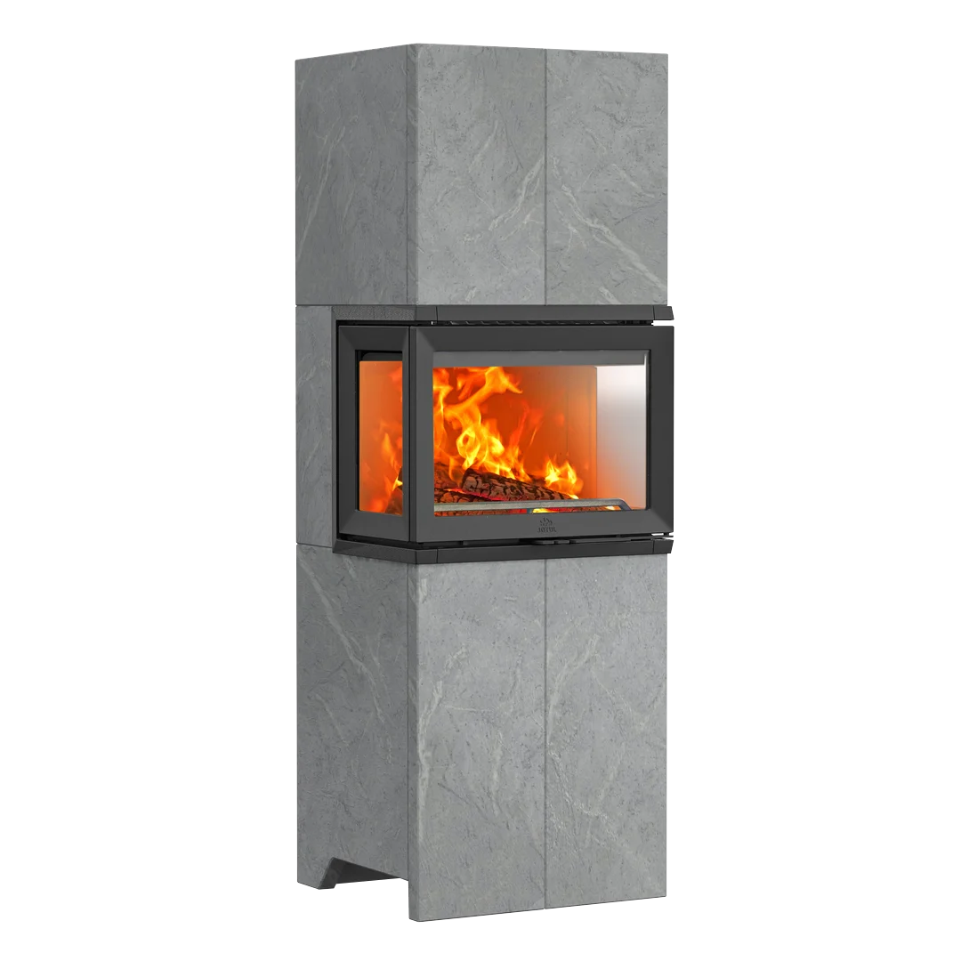 Jøtul FS 173 är en exklusiv täljstenskamin som kombinerar modern teknik med klassisk värmelagring. Kaminen är byggd kring insatsen Jøtul I 520 FRL och erbjuder en imponerande eldupplevelse tack vare stora glasytor på tre sidor – perfekt för dig som vill njuta av lågornas sken från flera vinklar i rummet.