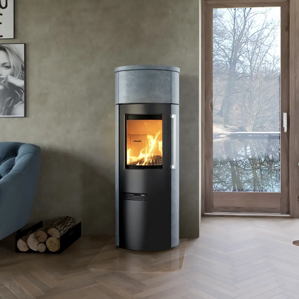 Den marmorerade täljstenen ger kaminen en naturlig, tidlös karaktär samtidigt som den håller värmen långt efter att elden har slocknat. I toppen finns ett integrerat värmemagasin som ökar kamineffekten ytterligare och ger en jämnare värmeavgivning under lång tid.