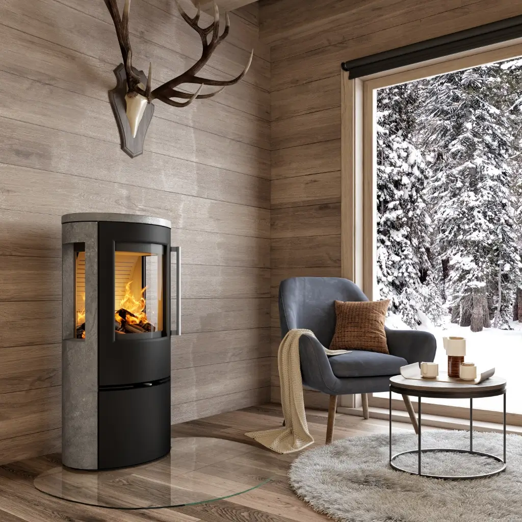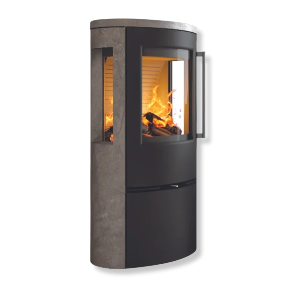 Letar du efter en modern vedkamin med både design och funktion i toppklass? Termatech TT23RGS är en elegant täljstenskamin som förenar skandinavisk form med smart värmelagring. De rundade sidorna i massiv täljsten ger kaminen ett exklusivt utseende och fungerar samtidigt som naturlig värmebuffert – stenen behåller och avger värme långt efter att elden slocknat, vilket ger ett behagligt inomhusklimat i flera timmar.
