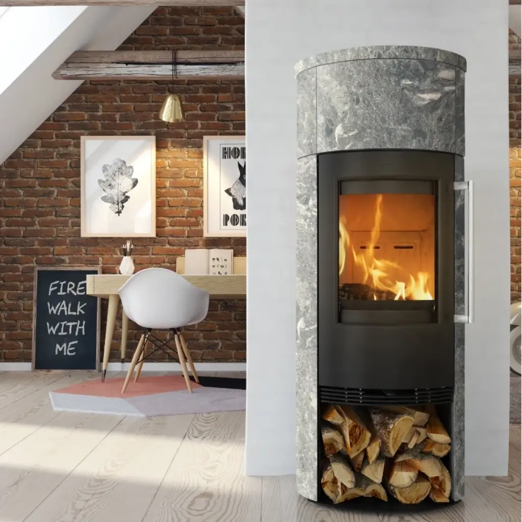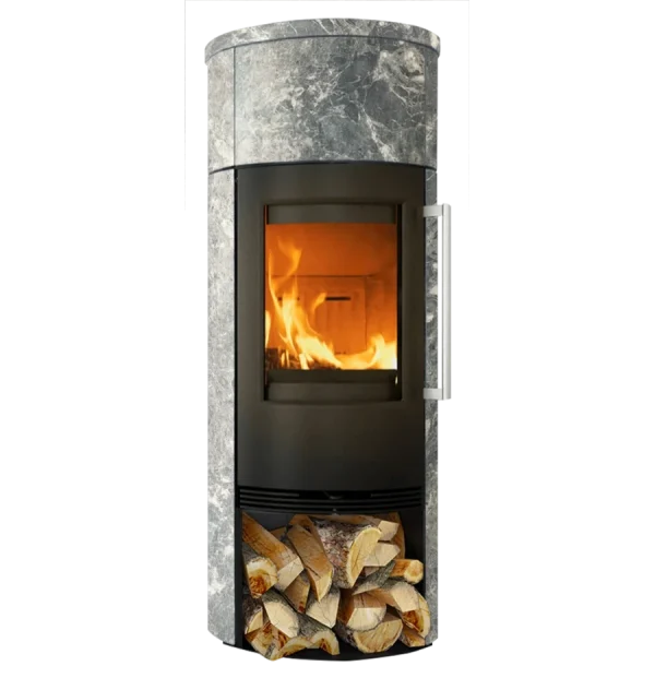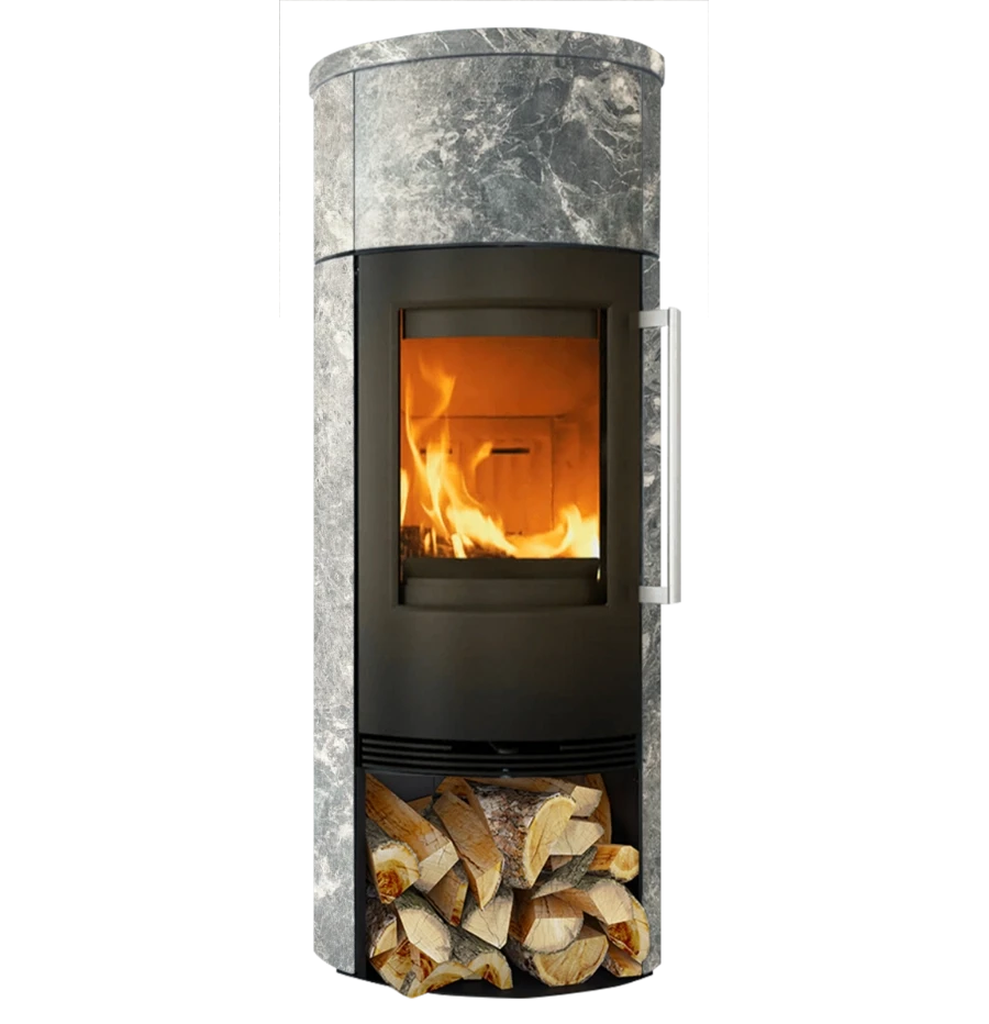 Täljstenens naturliga egenskaper gör den till ett av de mest effektiva materialen för värmelagring. Den absorberar värmen under eldning och avger den långsamt efteråt, vilket skapar ett behagligt inomhusklimat långt efter att lågorna slocknat. I denna modell ingår dessutom en generös mängd dold täljsten i toppsektionen för ytterligare värmelagring.