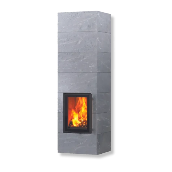 Kaminens tydliga plattsättning följer luckans vertikala linjer och skapar ett rofyllt och enhetligt intryck. Du kan välja mellan flera exklusiva ytmaterial i täljsten – från klassiskt släta plattor, till räfflade ytor eller den konstnärliga Grafia-ytan, skapad med vattenskärning för ett unikt mönster och djup.