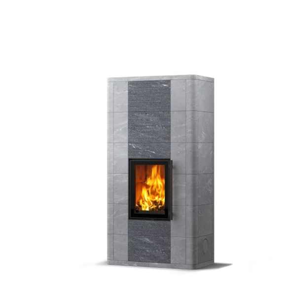 Ugnen är klädd i täljstensplattor i varierande storlekar, vilket ger en levande och elegant struktur. Ytan kan anpassas efter din stil – välj mellan helt släta plattor eller en kombination av släta och räfflade ytor. Den räfflade Grafia-ytan är unik, skimrande och formad med vattenskärning för en oregelbunden, taktil känsla.