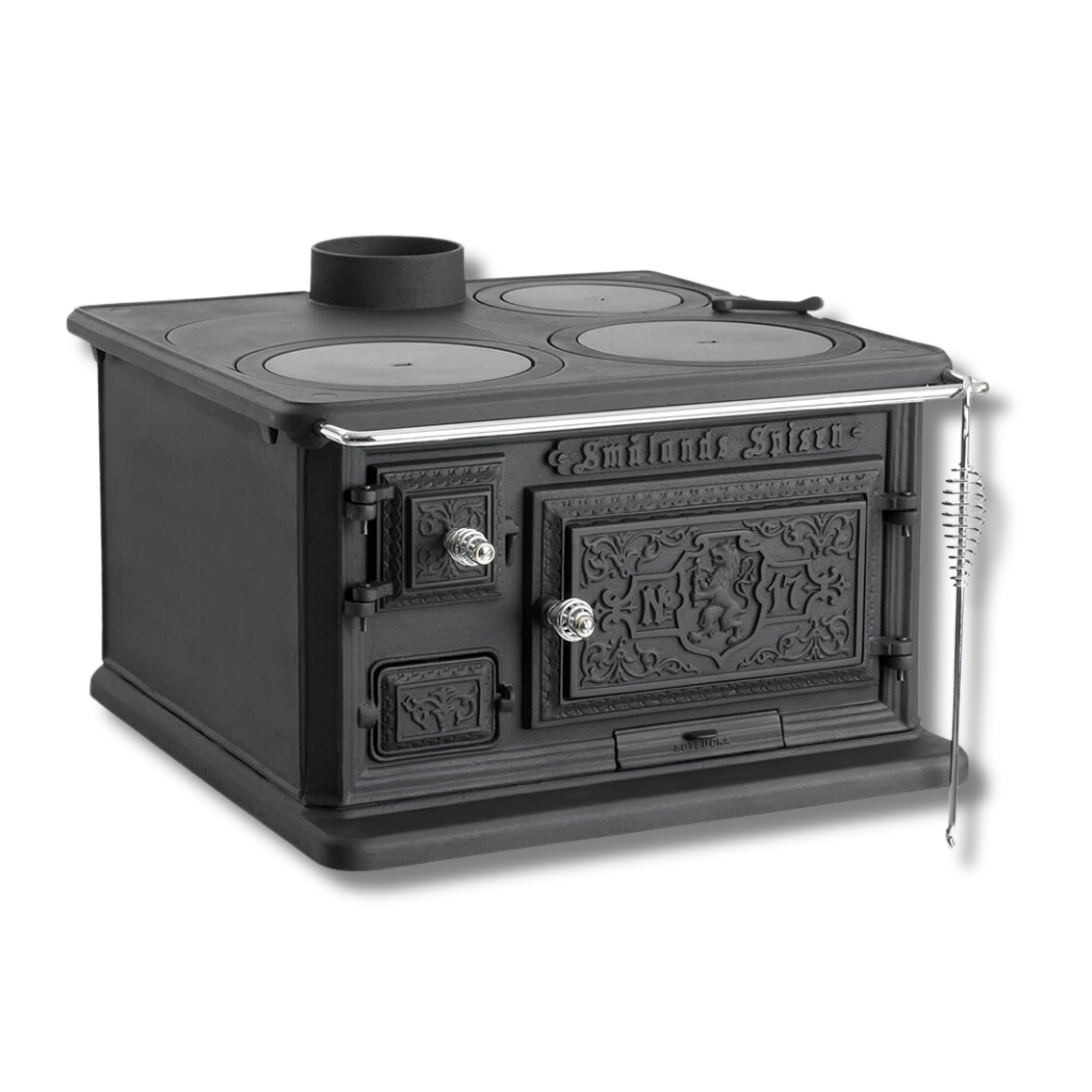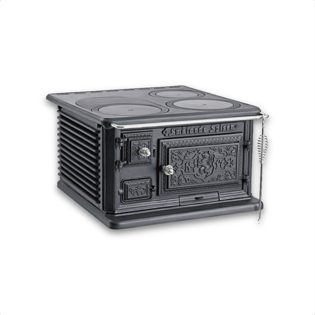 Smålandsspisen 1896 kombinerar det bästa av två världar: traditionell design från slutet av 1800-talet och effektiv, modern förbränningsteknik. Med sin robusta konstruktion och vackra ornament är det här en vedspis som förgyller både lantliga hem och moderna kök. Den sprider inte bara värme, utan även en hemtrevlig och tidlös känsla. Dessutom kan du laga mat och baka direkt på spisen – perfekt för både vardag och krissituationer.
