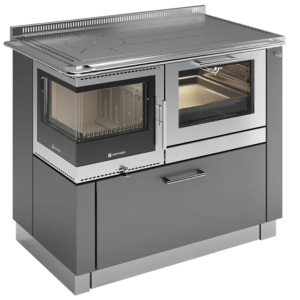 Spisen är utrustad med Pertingers patenterade flerutloppssystem för rökavgång, vilket gör installationen flexibel och effektiv. Du kan enkelt anpassa rökgasutloppet för bästa drag, oavsett hur ditt kök är planerat.