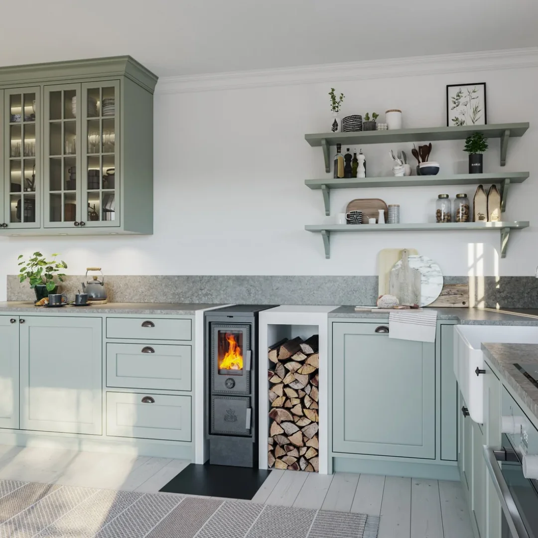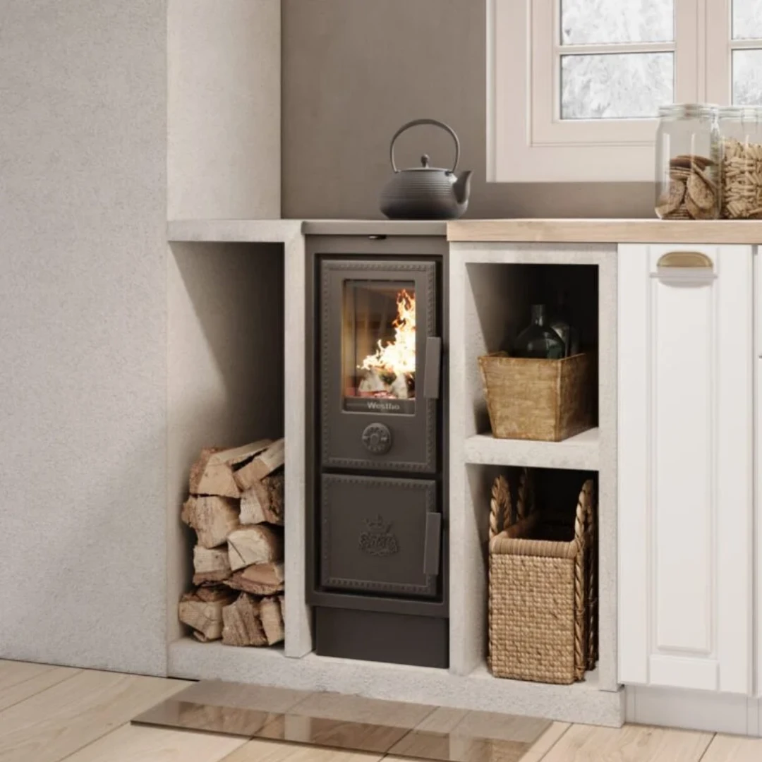 Den här modellen passar perfekt för dig som vill kombinera klassisk vedeldning med modern effektivitet, i ett format som fungerar lika bra i mindre kök som i större öppna ytor.