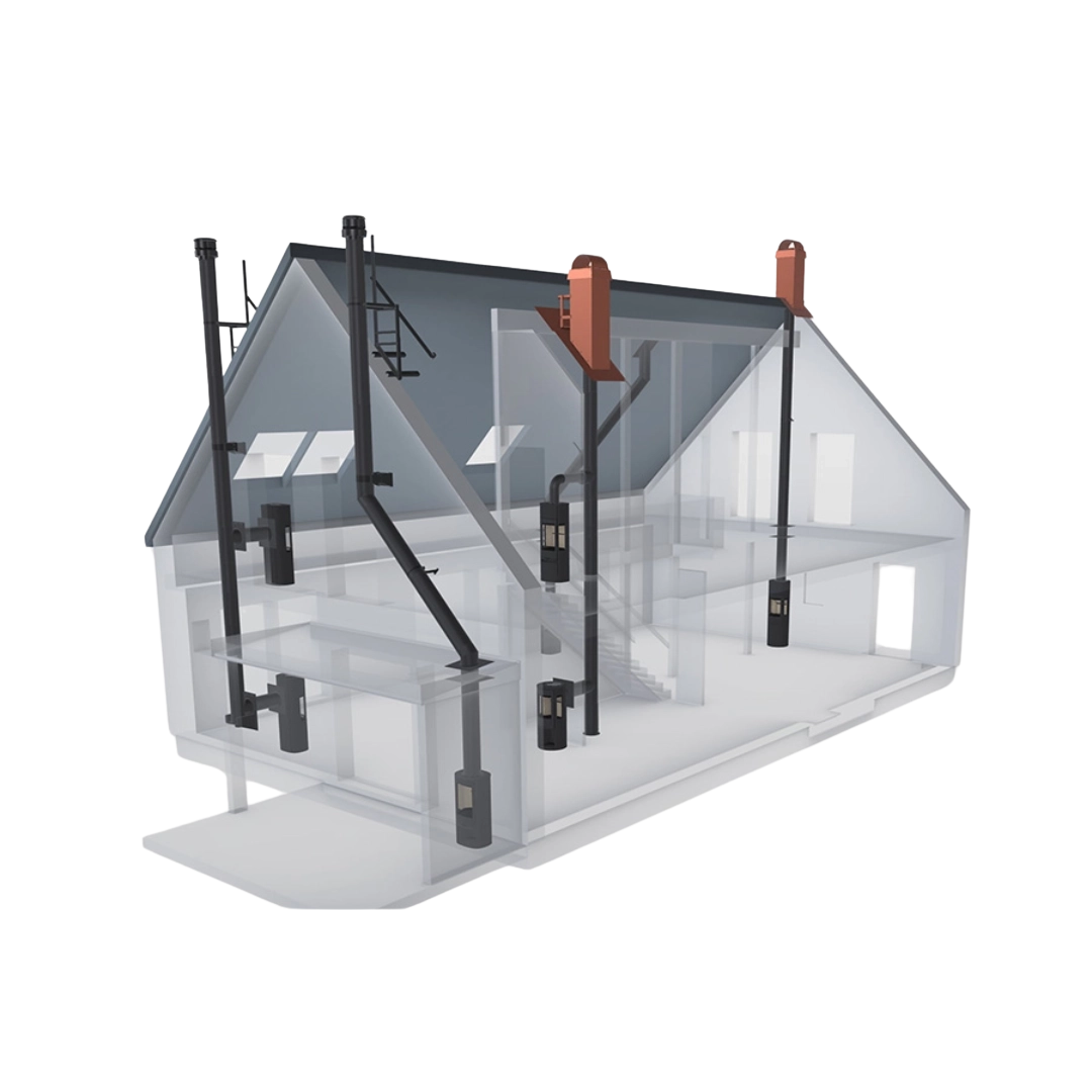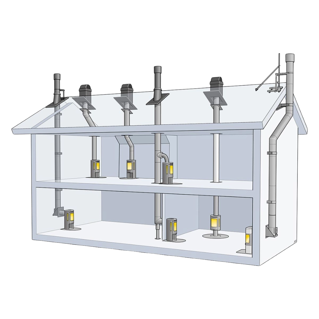 Systemet är flexibelt och modulärt, vilket gör det enkelt att anpassa installationen efter husets planlösning. Du väljer själv om skorstenen ska gå synligt genom rummet eller dras diskret genom schakt i vägg eller tak. Premodul erbjuder flera färgalternativ, dimensioner och vinklar, så att du får en lösning som harmonierar med både kaminens stil och hemmets design.